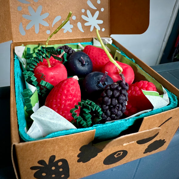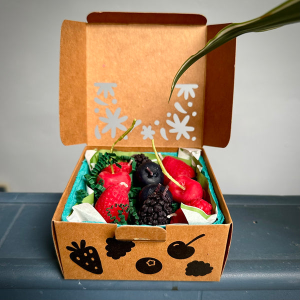 A sweet twist on birthday tradition, this set includes ten miniature fruit-shaped candles—two each of strawberry, blueberry, blackberry, cherry, and raspberry. Each one is handcrafted from 100% beeswax and designed to resemble real berries, using molds made from produce sourced at our family farm, local markets, and grocery stores. These unscented birthday candles are tucked inside a reusable berry basket and packaged with crinkle paper in a kraft gift box—ready for gifting, merchandising, or adding a playful pop to cakes, tarts, and celebrations of all kinds. ✨