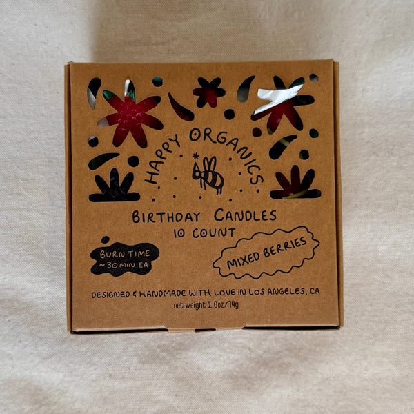 Product Details Includes: 10 birthday candles (2 each: strawberry, blueberry, blackberry, cherry, raspberry) Materials: 100% beeswax, cotton wick, eco-friendly dye (non-carcinogenic, phthalate-free, third-party tested) Handmade in: Los Angeles, CA Safety: Third-party tested 📦 Packaging Display: Candles nestled in crinkle cut paper inside a reusable berry basket Outer Packaging: Kraft box (4" x 4" x 2") with branding